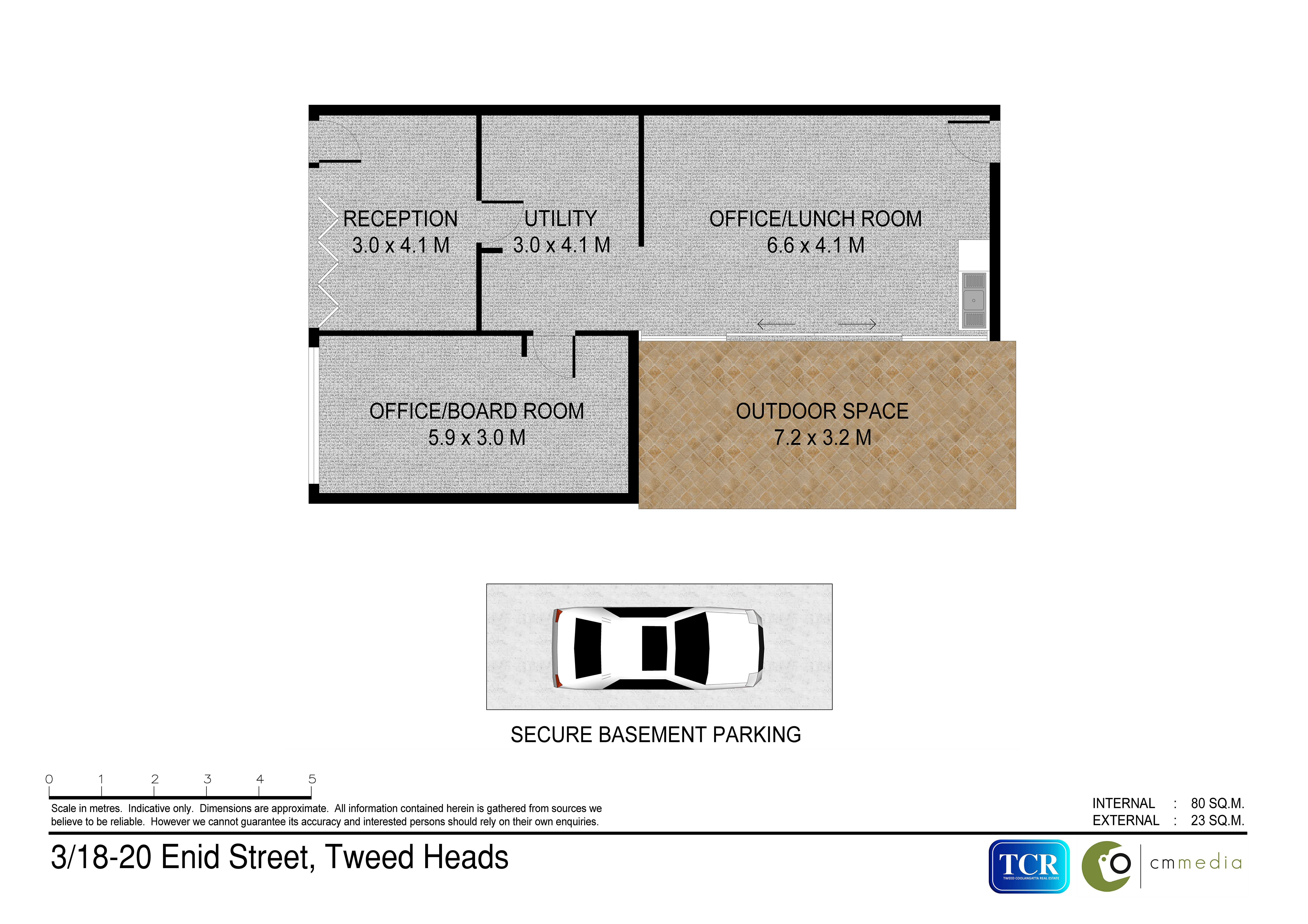The office space is 72m2 with out door courtyard of 22m2, plus single car space